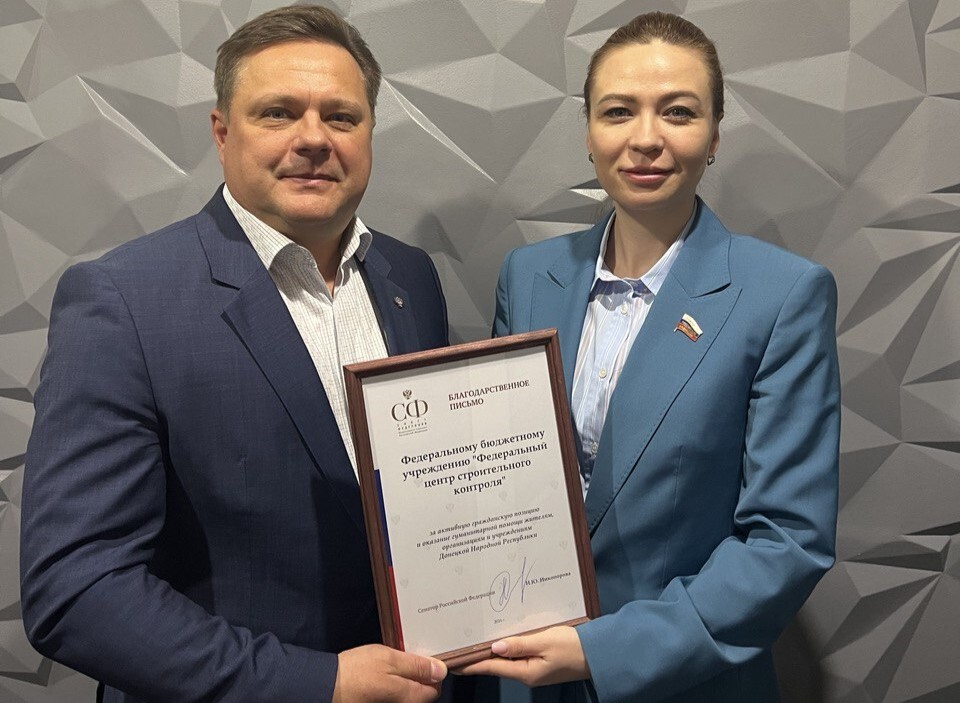 Сенатор РФ от ДНР Наталья Никонорова вручила благодарственное письмо Совета Федерации коллективу ФБУ «РосСтройКонтроль» за активную гражданскую позицию и оказание гуманитарной помощи жителям, организациям и учреждениям ДНР.